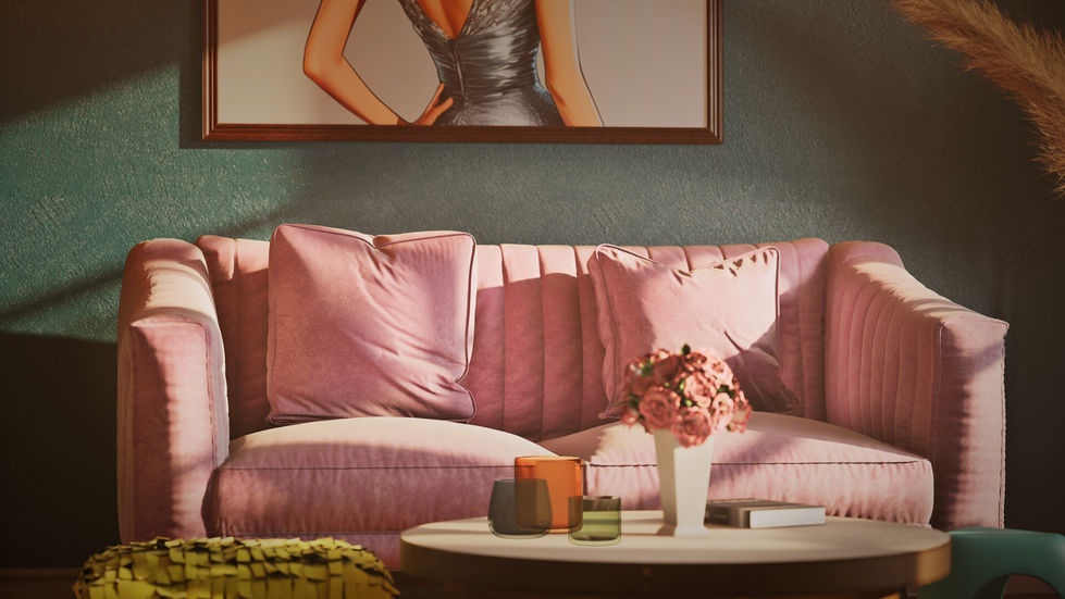 This stylized living room scene was created as a real-time walkthrough using Unreal Engine 5, blending high-quality modeling, detailed material work, and cinematic post-production. The space features a plush pink velvet sofa, pampas grass, ambient lighting, and curated decor for a warm, modern aesthetic.